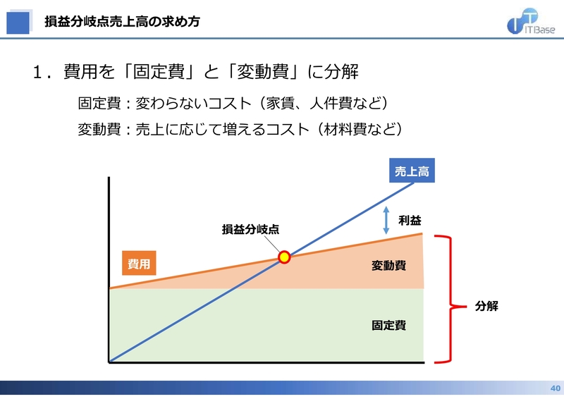 - 固定費:家賃、人件費、減価償却費など、売上がなくても発生する費用